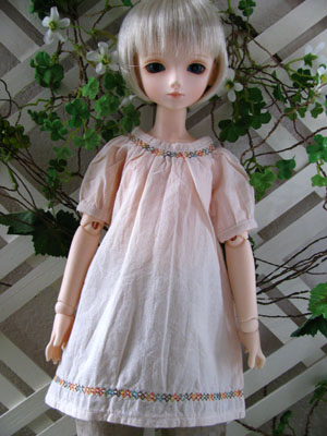 薄手の淡いピンク色の生地で作ったチュニックに、色が混ざり合った糸でステッチをかけました。