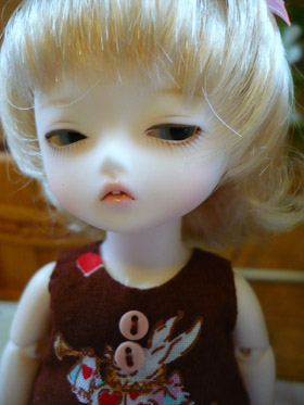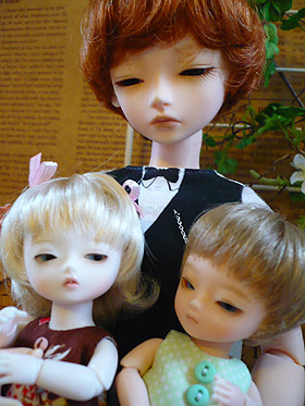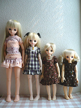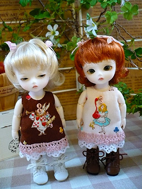 つづきはこちら アノンとジーンに色違いのお揃いワンピを作りました。 ブーツもウイッグも色違いのお揃いです。 服の雰囲気は似ているのに何だか対称的な2人になりました。 ノースリーブの型紙は一回作ってしまえば後は色々使いまわせるので楽しいです。 お針子の幅が広がりました。 アノンは白のアリス柄 赤毛のウイッグでいつも以上にぽやんとしています。 ジーンは茶色のウサギさん 金髪でクールな感じです。 そうそう。ジーンのアイをグラスアイに変更しました。 デフォのアクリルアイも雰囲気があって良かったのですが、 こっちの方が表情が柔らかくて好みです。 「あのね、ジーンちゃんが来てアノンすごく嬉しいの」 「そう?ありがとう」 ジーンがウチにやってきて一番嬉しそうなのはアノンでした。 美白同士の2人なので、並べるとすごく可愛いです。 Leilaの名前はレインにしました。 これからこの子もよろしくお願いします。 そして、今日はほかの子達との背比べをしてみました。 左からTF、MWJr、Leeke2nd、LEEKE1stです。 リケとの身長差があんまりないだろうと思っていたのですが、実際に並べてみると結構違ってびっくりです。 ちょうどTFとリケの間くらいなのかな? 何だかキレイに並んでるのが面白いです。 続きは拍手のお返事です。 つづきはこちら |