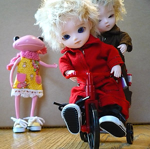 ドールについてウエットに答えるバトンだそうです。 自分はなかなかにウエットな気がするので、楽しくバトンが出来そうです。 以下、回答になります。 ドールの性格付けとかが苦手な方はお気をつけ下さい。 つづきはこちら 「…なんでお前と二人乗りでしかもオレは後ろなんだろう…?」 「それは僕も是非知りたいね。」 シルバニア用の自転車に妹がエコちゃんを乗せていたので便乗してヴァンとジャンを乗せてみました。 ちょっとハンドルが低いですがそれ以外はぴったりです。 1人だとバランスがとりにくいのですが、2人乗りにすると上手くバランスが取れます…でも乗ってる2人はちょっと不満そうですね。ヴァンとポロンの方がしっくりきたかな? 「…あ、あんまり強く掴まないでくれよ。」 エコちゃんとジャンでも1枚。 この2人は何だか妙にお似合いで並べるのが楽しいです。 自転車写真を撮るときに他にも色々面白いものとPF達の写真を撮ったのでちょこちょこアップして行こうと思います。すごく楽しそうなバトンも頂いたので、それもやりたいです。あ、あと作りかけの服も仕上げたいな。 やりたいことがたくさんです。